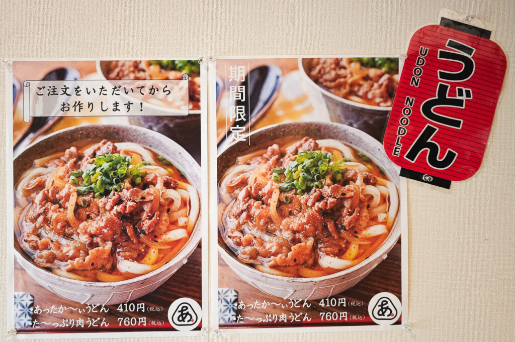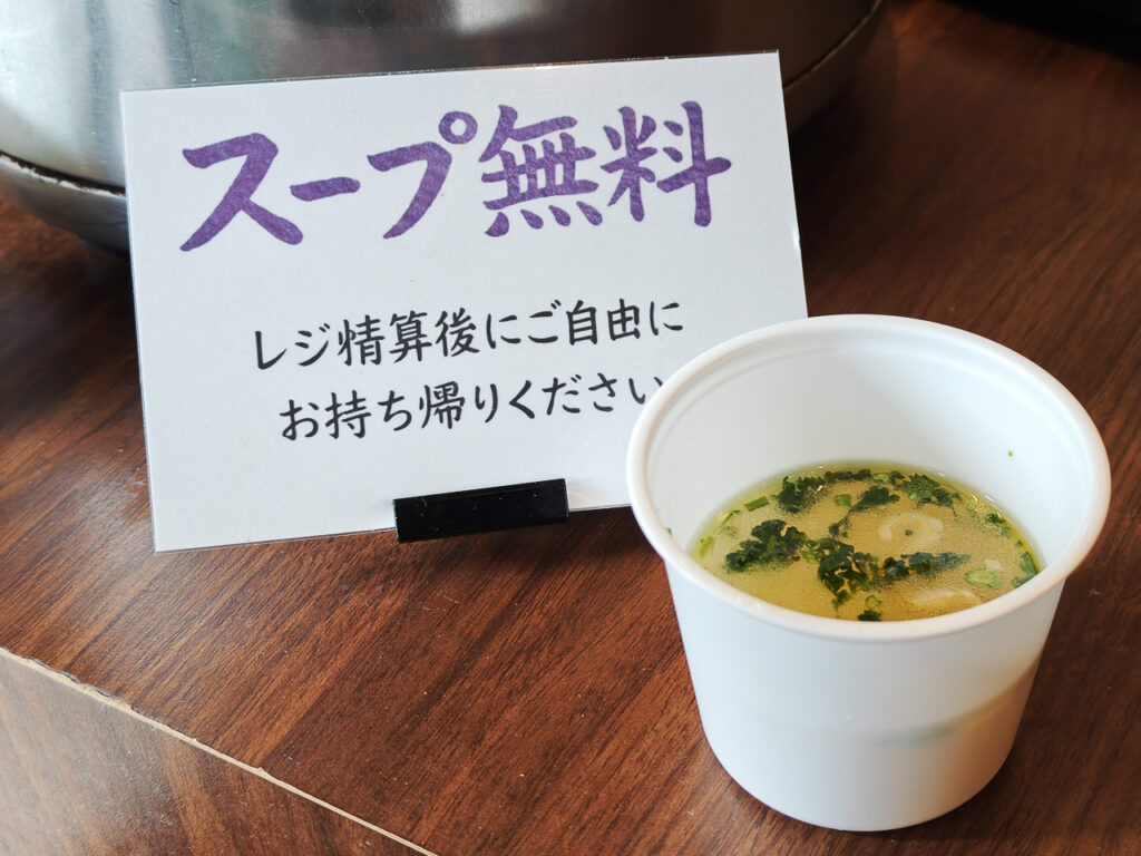 おにぎり以外にも、人気のから揚げ、うどん、日替わりカレー、そして無料の日替わりスープも提供。